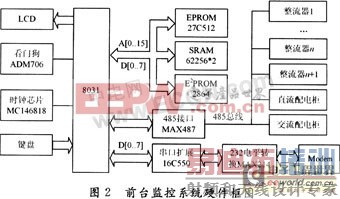 前台监控系统硬件框图见图2,系统以8031单片机为核心,人机界面采用LCD显示,有操作键盘。看门狗采用ADM706,以提高系统可靠性。时钟芯片采用MC146818,用于记录实时数据或告警信息产生的时间。程序存储器采用27C512 EPROM,系统使用到的有限汉字库存放在27C512的高端地址,数据存储器采用2片62256 SRAM和1片2864E2PROM。2864是电擦写、非易失存储器,用于保存系统的运行参数,该参数可以在前台通过键盘设定,也可通过监控中心远程设定。采用MAX487扩展一个485接口,用于同交流配电柜、直流配电柜、整流器模块以及其他环境设备的通信。数据采集用的传感器放置在交流配电柜、直流配电柜、整流器等相对独立的智能设备中。采用可编程通用异步通讯接口芯片16C550和电平转换芯片MAX214扩展了一个RS 232口,用来连接Modem。