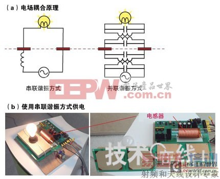 竹中工务店正在开发利用电场耦合原理的供电系统(a)。使用串联谐振的供电系统成功地以90%的效率向白炽灯泡供应了100W电力。