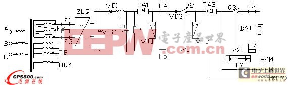 图中VD3的作用是一个逆阻二极管,防止外部电源倒灌充电机。二极管后边的开关就是充电机输出开关。从这里出去的直流分为三路:一路去电池,一路去动力合闸母线,另一路为控制母线提供前级电源。