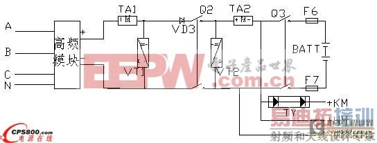 ⑴ 由于高频模块具有良好的输入过欠压和输出过欠压保护,而且具有良好的限流功能,因此,在输入侧和输出侧不需另加熔断器保护。由于高频模块本身具有电压电流显示功能,而且监控器也可以显示系统中的其他参数,因此,在高频系统中,相控系统中常用的表记也可以省略。