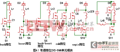 从图3中不难分离出六种不同的基本有源箝位ZVS-PWM单元模块,即buck、boost、buck-boost、cuk、zeta、和sepic箝位单元模块,如图4所示。
