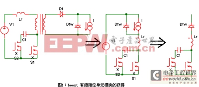 如图1所示,可以从boost型箝位隔离单端正激变换器获得boost型有源箝位ZVS-PWM单元模块。
