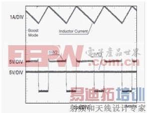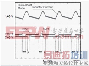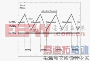 图 1 示出了降压-升压型转换器的简化原理图。LTC3789 负责控制 4 个外部 N 沟道 MOSFET (A、B、C、D)。功率级采用一个电感器 (L) 和一个用于提供电流模式控制和电感器电流限制功能的电流检测电阻器 (RSENSE)。图 2 至图 4 示出了降压、降压-升压和升压操作模式的开关波形。
