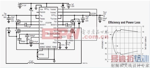 图 5:从 4V~38V 输入产生稳定的 12V/5A 输出以及相关联效率与功率损耗的关系曲线