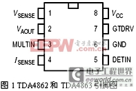 TDA4862和TDA4863均采用PDIP-8和PDSO-8两种封装形式。本文主要介绍PDIP-8引脚封装,其引脚排列如图1所示。