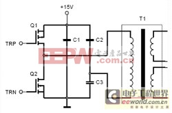 铁氧体隔离变压器为驱动电路的副边提供驱动信号,并提供驱动IGBTs开关动作所需要的能量。图2是DC/DC变换器的电路图。信号发生电路被集成到专用的ASIC芯片当中。通过两路互补的500kHz同步脉冲信号TRP和TRN输出,分别驱动一个p沟道MOSFET和一个n沟道MOSFET。为了防止上下桥臂的两个互补MOSFETs同时导通发生短路,15v脉冲信号采用互锁设计 。在副边采用了整流和稳压电路设计以产生一路正电压和一路负电压。由于集成的DC/DC变换器,就不再需要外部的隔离电源。