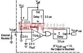 [p] 在MC44603的过压保护电路中包含一个延迟锁存器,其延迟时间为2μs。这样,当过压状态持续时间超过2μs,延迟锁存器的输出将为高电平,直到VREF被禁止。如果过压状态持续时间超过2μs,控制器的输出将被禁止,直到VCC断开后又重新恢复。当过压比较器的参考电压Vref开始逐渐恢复时,过压保护状态还将继续持续5μs的时间,直到Vref完全恢复,并进入稳定状态,此时VCC才重新恢复正常供电。过压保护控制电路原理图如图10所示。在过压保护信号输入端(引脚6)增加一只外接电阻,可以实现对VCC电平的调节。