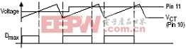[p] 借助MC44603的最大占空比和软启动控制功能,可以将最大占空比限制在80%以下。由于MC44603引脚11与其内置电流源相连,该引脚上的电压可方便的通过外接电阻进行设置。在引脚11上外接一只电容,就可以实现软启动功能。最大占空比和软启动控制电路原理图如图7所示,最大占空比控制波形图如图8所示。