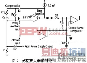 [p] MC44603中误差放大器的典型直流电压增益为70dB,其非反相输入端与内部2.5V基准电压相连,变换器的输出电压经检测电阻分压后与误差放大器的反相输入端相连。误差放大器的输出端外接环路补偿电路后可以实现对误差放大器的补偿,如图3所示。