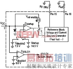 在欠压锁定电路中,Vref和Iref由引脚16上的接地电阻Rref决定,如图11所示。而引脚15上的接地电阻RF Stby则用于固定待机频率。