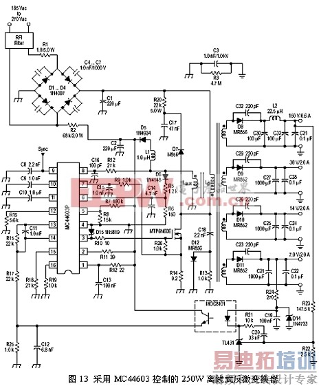 采用MC44603控制的250W离线式反激变换器如图13所示。该变换器中的开关管采用双极性晶体管,其输入电压范围为185VAC~270VAC,工作频率20KHz,效率81%,待机功耗3.3W。