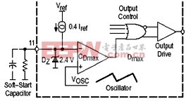 引脚11与控制器内置的0.4IREF的电流源相连,通过外接电阻可十分方便的实现对该端电压的控制。另外,该端外接的软启动电容在VCC低于9.0V时开始放电。如果该端没有外接元件,该端内部的齐纳二极管将对该端电压进行箝位。由于齐纳二极管的箝位电压高于振荡器输出信号的峰值,因此软启动和最大占空比控制功能被禁止。