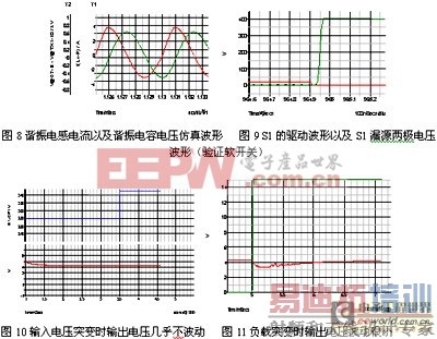 本文利用SIMetrix仿真软件对移相全桥谐振变换器进行仿真分析。电路参数设置为:输出Po=200W,输入电压Vin=400v,谐振电感Lr=150μH,谐振电容为47n,开关频率Fs=200kHZ。图8谐振电感电流以及谐振电容电压仿真波形,图9 S1的驱动波形以及S1漏源两极电压波形(验证软开关)。当输入电压突变时的动态响应和负载突变时的动态响应分别见图9和图10,仿真输出波形与理论分析完全相符,仿真结果表明上文工作分析是正确的。