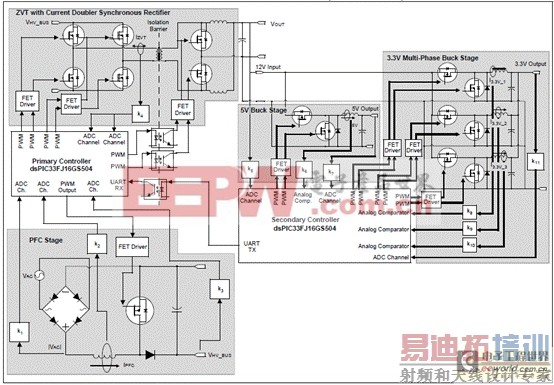 图3.采用dsPIC33FJ16GS504的PFC 和三输出(12V,5V和3.3V)AC/DC电源框图