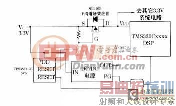 在这个电路里,SVS负责监测外部输入电压。上电时,当3.3V电压超过SVS的门限电压200ms后,RESET引脚输出为低,驱动场效应管工作,把外部的3.3V电压加到DSP的I/O上。这里假设直流电源转换器的响应时间小于200ms。