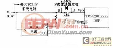 这种方案是所有方案中最简单的一种。它用一个P沟道的场效应管作为电源分配开关。这种方法要求直流电压转换器具有PG(Power Good)引脚。在核电压输出未到达额定值之前,PG引脚一直输出为高。当核电压输出达到额定值后,PG引脚变低,驱动场效应管打开,把外部3.3V电压加到DSP的I/O上。所以,这种方法可以保持正确的上电顺序。