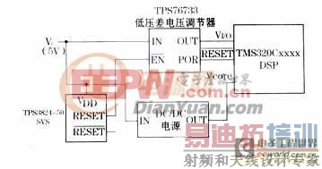 由于输入电压高于3.3V,所以在电路中还必须使用电压调节器。这里选用的是TI的低压差电压调节器(LDO),在实际设计中选用具体的LDO时,还要考虑输出电流的驱动能力等因素。在TI的网站上有为C5000和C6000系列推荐的电源系列。
