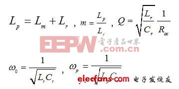 由此可得知此谐振网路中具有两个谐振频率,一个由Lr及Cr所组成,而另一个由Lp及Cr所组成。且其增益随谐振频率改变而不受负载变化影响。若操作频率(w)=谐振频率(w0)时,可得: