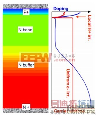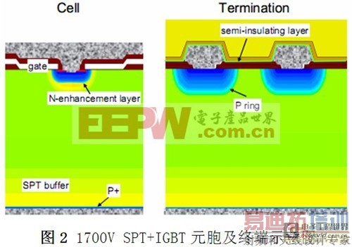 同原始的平面IGBT元胞相比,SPT+技术的主要优点是在减小导通损耗的同时,保留了具有相同开关控制能力的SPT(软穿通)纵向设计。上述优点的实现,是通过在IGBT MOS单元的P-well周围引入一个N型增强层来实现的,如图2剖面结构所示。增强层增大了IGBT阴极端的载流子浓度,因此,在没有显著增加关断损耗的同时使导通压降降低。N型增强层的杂质分布形式是仔细优化了的,以避免任何对SPT+IGBT的关断安全工作区及耐压能力的负面影响。1700V SPT+IGBT的最终设计将胜过具有相同面积的以往SPT产品,它的导通损耗更低而关断损耗与SPT相当,可多承受20%的电流。