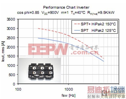 图1逆变器输出电流随开关频率变化:1700V SPT与SPT+HiPak2对比2 1700V SPT+高温芯片组技术