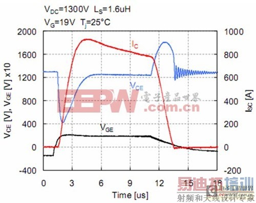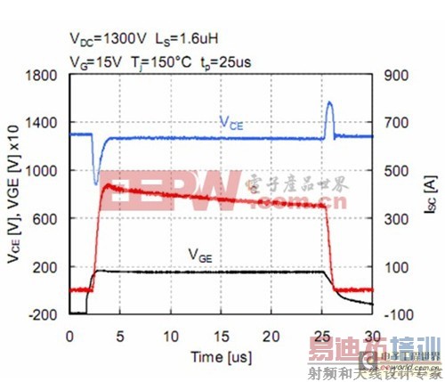 [p] 新型1700V SPT+IGBT的卓越短路能力如图12和图13所示。从图12 可以看到结温T j=150℃、直流电压为1300V时的短路测试试验。在长达26μs的脉冲时间内,短路电流380A,总耗散能量为12.2J测试后,没有观测到热奔现象。为获得一个高短路SOA能力——甚至在整个-40℃~150℃的温度变化过程中,门极电压超过了15V的标准门极驱动电压,——SPT+ IGBT采用了SPT缓冲层和阳极设计。图13显示了室温条件下,在门极电压V G=19V时,所测得的典型短路SOA波形。