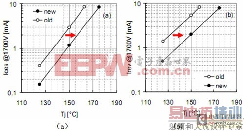 图14同150℃ SPT+产品相比,新的IGBT(a)和二极管(b)在漏电流的改善
