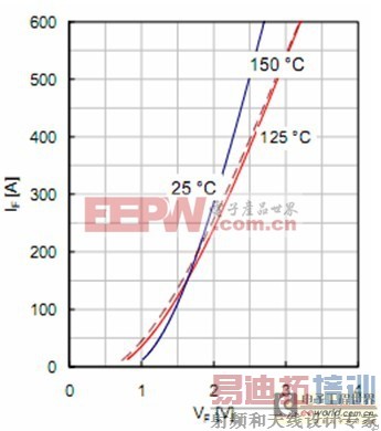 图4给出了T j=150℃时不同栅压下,1700V SPT+IGBT芯片所测得的通态曲线。标称电流下典型的通态压降(V CE,on),在T j=125℃时为2.95V,T j=150℃时为3.1V。从低电流开始,SPT+IGBT的通态压降(V CE,on)就表现出强正温度系数。它保证了有同模块中各芯片间电流的良好分配。如图5所示,结温为T j=150℃时,测得的1700V二极管典型正向电压为2.15V。在标称电流一半处,二极管(导通压降)也表现出了正的温度系数。这是优化局部载流子寿命分布的结果。在标称电流下,工作在室温和125℃时的压降差为250mV,这也确保了芯片并联时的安全。正如图6看到的,高温反向阻断下,与之前的SPT二极管工艺平台相比,二极管的漏电流减小了两倍多。