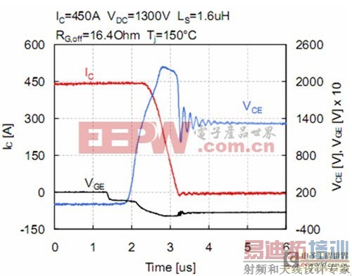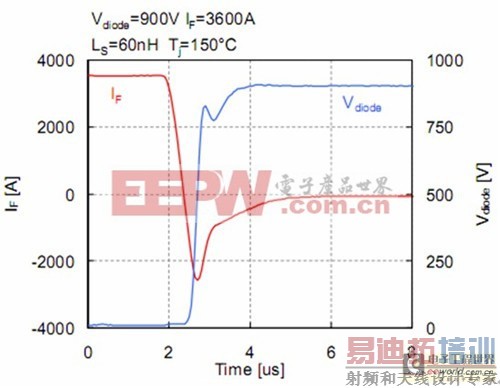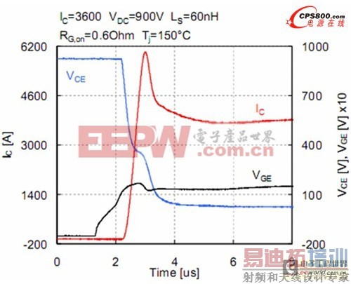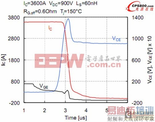 为了说明这种新的1700V SPT+芯片组能够应用于高温和大电流情形下,测量了1700V HiPak模块T j=150℃的开关曲线。图7所示的关断曲线是在标称下测得的,即I C=3600A、V CE=900V。在本测试中,模块的关断测试采用R G,OFF=0.6Ω,L S=60nH,电压上升率为3000V/us。优化N基区与SPT缓冲层的结合,允许集电极电流缓慢的衰减,保证了关断过程软,没有过高的电压尖峰或振荡。图8给出了相同条件下的开通波形。平面SPT+元胞的输入电容小,允许IGBT电压在开通瞬间迅速下降。由于SPT+二极管的低损耗,典型的开通损耗值为1.25J。