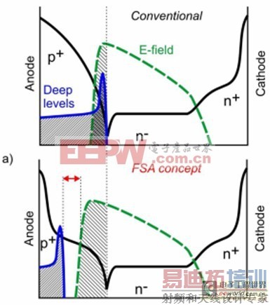 图16反向阻断过程中普通二极管(a)和FSA二极管(b)的掺杂浓度及阻断态相关电场分布草图