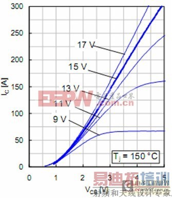 图4在T j=150℃时不同的偏压下,1700V SPT+IGBT通态曲线