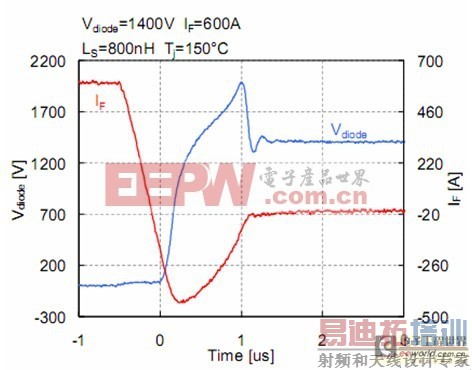 在标称条件下,二极管的反向恢复波形如图9所示。二极管关断时流过的尾电流足够短且平滑,从而避免了任何经过二极管和IGBT的电压振荡。这允许二极管以di /dt =11400A/us变化率转换,大大减小了IGBT的开通损耗。在标称条件下,二极管的恢复损耗为1.21J。