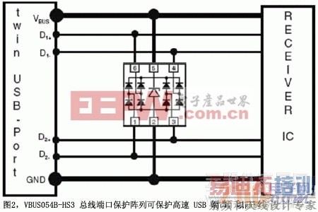图2所示的二极管阵列 (VBUS054B-HS3) 可保护双高速USB 端口,以防瞬态电压信号。该阵列对略低于接地电平的负瞬态进行箝位,同时在略高于5V工作电压范围对正瞬态进行箝位。