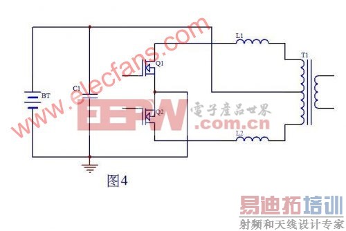 从图4中可以看出L1,L2就等效于变压器初级两边的漏感,我们来分析一下Q1导通时的情形:当Q1的栅极加上足够的驱动电压后饱和导通,电池电压加到漏感L1和变压器T1初级上半部分,当然绝大部分是加到T1初级上半部分,因为L1比T1初级上半部分电感小得多。此时Q2是截止的,主电路电流方向为从电池正极到T1初级上半部分到L1到Q1的DS再回到电池的负极;L1上电压的极性为左负右正,T1初级上半部分电压的极性为上负下正,如图5所示:
