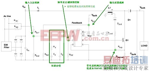 NCP1611有源功率因数校正(PFC)控制器适用于AC-DC适配器、平板电视及照明镇流器及其它中功率离线应用的升压预转换器。该控制器采用正待批专利的CCFF架构。在这种模式下,当电感电流超过可编程值时,电路运行在CrM模式下。当电流低于这个预设水平,电流为零(null)时,NCP1611可线性降低频率至大约20 kHz。CCFF可最大限度提高额定负载和轻负载效率。特别是,可将待机损耗减少到最低限度。该控制器具有一系列强大的保护功能,可妥善处理各种电源工作和故障条件。NCP1611拓展了传统CrM PFC控制器的优势。图2是NCP1611典型应用电路图。