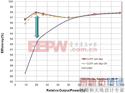采用CCFF控制架构,最大的好处莫过于提升能效。采用传统CrM(临界导电模式)/BCM(边界线导电模式),在负载降低时,开关频率上升;负载极低时,控制器可能进入“跳周期模式”,滋生可听噪声。而采用CCFF控制架构,可以在负载降低时降低开关频率,减小功率损耗;在轻载时,控制器可以钳位高于可听噪声频段的较低频率;负载极低时,则采用跳周期模式工作(可以轻易关闭)。因此,这种谷底导通可进一步提升能效,减小电磁干扰。图4比较了基于NCP1611CCFF PFC及传统CrM PFC在不同负载条件下的能效。由图中可见,在10%轻载条件下,基于带跳周期模式的NCP1611的演示板的能效高达近97%(关闭跳周期模式下也达近96%),而基于传统CrM架构的演示板能效仅为近87%,相关近10%。可见NCP1611在提升电源轻载能效方面表现尤为优异。