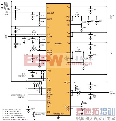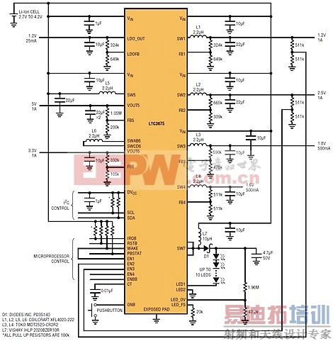 LTC3675 是一个节省空间的单芯片电源解决方案,适用于靠单节锂离子电池运行的多轨应用。其 4mm x 7mm QFN 封装中含有两个 500mA 降压型稳压器、两个 1A 降压型稳压器、一个 1A 升压型稳压器、一个 1A 降压-升压型稳压器、一个能以高达 25mA 驱动两串 LED 的升压型 LED 驱动器、以及一个为内务处理微处理器供电的始终保持接通的 25mA LDO。所有稳压器都可通过 I2C 加以控制。图 1 所示是一个靠单节锂离子电池运行的 8 轨解决方案。