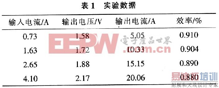 实验曲线如图5所示,实验数据为输入电压12 V,输出电压2 V左右,测量电阻0.0025 Ω,最大输出电流20 A。