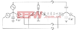 (1) 避雷器接在相—地间,如图1所示,接法简单,使用率高,但某种情况下满足不了绝缘配合的要求。例如电弧重燃产生高频电流,设A相重燃,A相电源经A相电容和中性点电容CN接通形成振荡回路,出现过电压。由于中性点电容远较主电容C为小,则CN阻抗大分压也大,过电压将出现在中性点电容CN上,其值可达定值的4.5倍。为此需要在中性点处配置氧化锌避雷器。如果发生一相接地,接地相电容器将承受对地过电压值的2/3。比健全相上的电容器过电压高得多,超过过电压倍数不超过2倍的要求。再者是两相保护元件残压之和,起不到限制相间过电压的作用。