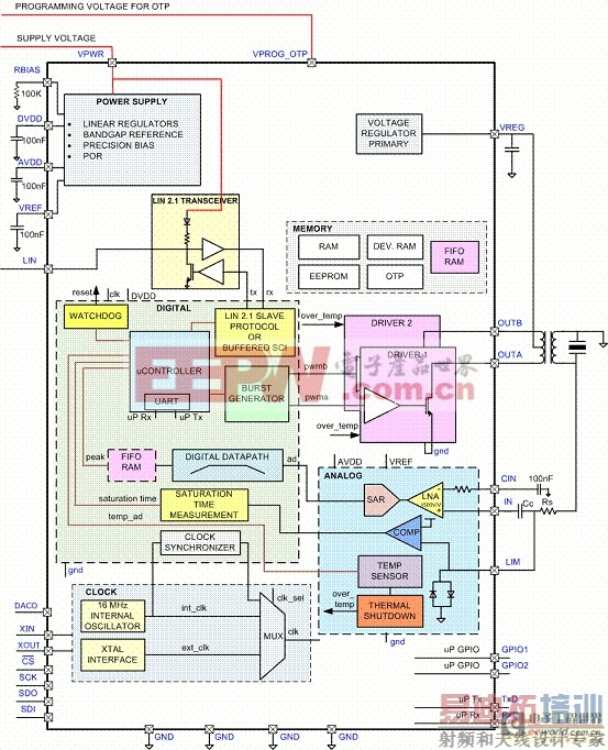 TI 公司的PGA450-Q1是全集成超声波传感器接口器件,集成了电压稳压器,12位SAR ADC,8位微控制器,数字带通滤波器,DAC,两个NMOS低边驱动器,低噪音放大器,振荡器,LIN 2.1物理接口协议接口.主要用于汽车泊车, 盲区检测和物体检测.本文介绍了PGA450-Q1主要特性,功能方框图, 应用电路图, 评估板PGA450-Q1 EVM主要特性,电路图和PCB布局图.