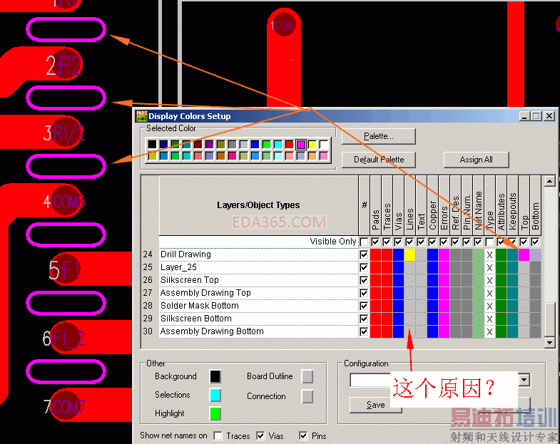可为何会这样呢,搞不懂PADS的层概念,真复杂,这似乎可以解释2005可以而9.2不可以了,因为9.2在这个颜色矩阵表中的最右边增加了两列:TOP、BOTTOM