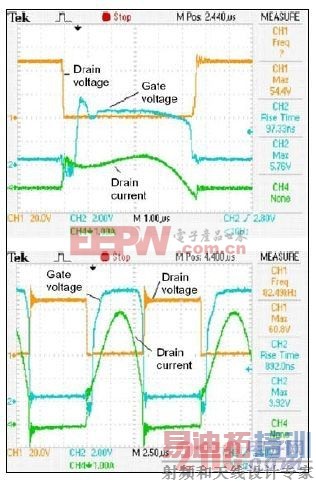 闸极电压随反向漏极电压的下降而逐渐降低,因而确保了MOSFET在电流过零点附近的迅速切断。换言之,可以更少的闸极电荷切断MOSFET,因而缩短了闸极电压的下降时间,并确保没有反向电流。此外,比例式闸极驱动器根据MOSFET的电流幅值调节其输出电压,这样,在漏极电流接近零之前,该MOSFET的闸极一直在得到加强。这样,在MOSFET关闭后,就将体二极管的导通时间缩至最短。图3为同步MOSFET的工作波形。在满载情况下,图3b显示,为获得低阻抗,在MOSFET的大电流期间压一直维持在10V左右。
