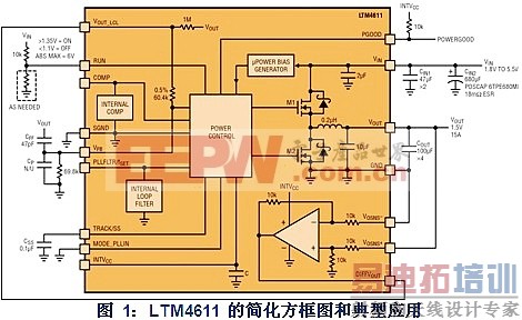 LTM4611 不需要采用辅助偏置电源为其内部控制 IC 或 MOSFET 驱动电路供电;它可依靠其输入电源产生其自己的低偏置电源。该内部偏置电源使得 LTM4611 能够采用低至 1.5V 的输入运作,从而可在所有线路电压条件下给其功率 MOSFET 提供强大的栅极驱动信号,并在使用 5V、3.3V 或更低总线电压的系统中实现高效率。LTM4611 背后是一种降压转换器拓扑,该拓扑负责对其输入电压进行降压,以向其输出端提供低至 0.8V 的电压和高达 15A 的连续电流。通过正确地选择输入电源 (取决于电源动态特性和瞬态负载响应) 和局部旁路电容,可在 15A 负载条件下实现一个低于 0.3V 的输入至输出电压降。LTM4611 采用一种固定频率峰值电流模式控制降压转换器方案,默认的工作频率为 500kHz。也可选择利用电阻器对 LTM4611 的 PLLFLTR/fSET 引脚进行引脚搭接,以将开关频率调整至介于 330kHz 和 780KHz 之间,或者,将开关频率同步至一个加至其 MODE_PLLIN 引脚的 360kHz 至 710kHz 时钟信号。