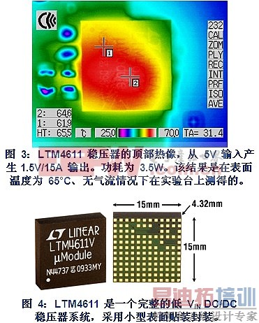 该器件的 LGA 封装允许从顶部和底部散失热量,因而便于使用金属底盘或 BGA 散热器。这种外型有助于在有或没有气流的情况下,实现非常好的散热。图 3 显示了 LTM4611 顶部的红外 (IR)热像,图中 LTM4611 将 5V 输入转换为 1.5V/15A 输出,在没有气流的情况下,在实验台上测得的功耗为 3.5W。其最高的表面温度约为 65°C。