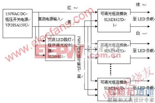 这是一个LED功率为112W的路灯,LED模块分为4组,每组为7串4并,28W。我们采用了香港炜达电子公司的150W,输出28V的市电稳压电源VP28SA150U,其总体框图如图2所示: