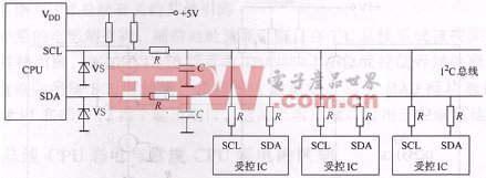 直接式I2C总线是指被控集成电路直接或通过电阻挂在I2C总线上,其电路工作原理图如图4所示。因为CPU的I2C总线输出端口内部电路形式为集电极开路(或漏极开路)形式,所以在CPU的I2C总线输出端必须通过上拉电阻R接+5V电源,为CPU的I2C总线输出端口的内部电路供电。图4中的电阻R为隔离电阻,C为抗干扰电容,主要是为了提高I2C总线上数据传输的可靠性,防止误动作进人维修状态和防止由于外部干扰信号改变I2C总线数据。稳压管VS是为了防止外部高电压损坏CPU的I2C总线输出端的内部电路。