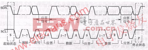 数据线上传输的控制信号,均按图3所示的内容和顺序先后传输:起始状态信号、被控电路地址、读写方式(数据传输方向位)、应答信号、数据信号、应答信号、数据信号、应答信号、终止状态信号。