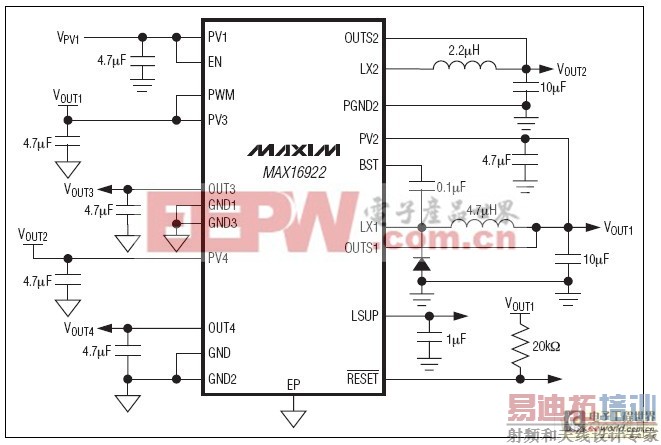 MAX16922电源管理集成电路(PMIC)专为中等电压汽车应用而设计,在小尺寸封装中集成了多路电源。器件包含一个高压降压转换器(OUT1)和三个级联连接的低压DC-DC转换器(OUT2、OUT3、OUT4)。OUT1和OUT2是降压DC-DC转换器,OUT3/OUT4是线性稳压器。器件还包含一路复位输出(/RESET)以及一路高压使能输入(EN)。