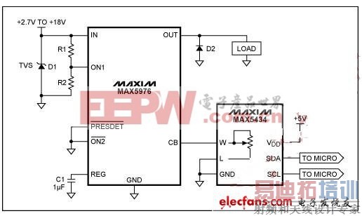 图2:MAX5976与非易失数字电位器MAX5434组合使用,实现可编程过流限值。
