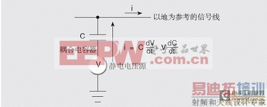 图1示出一个交流静电耦合的例子。在导体(例如电缆或印制电路板上的线)附近的静电电压源会产生正比于电荷变化率和耦合电容变化率的电流。该电流可以按下式来计算: