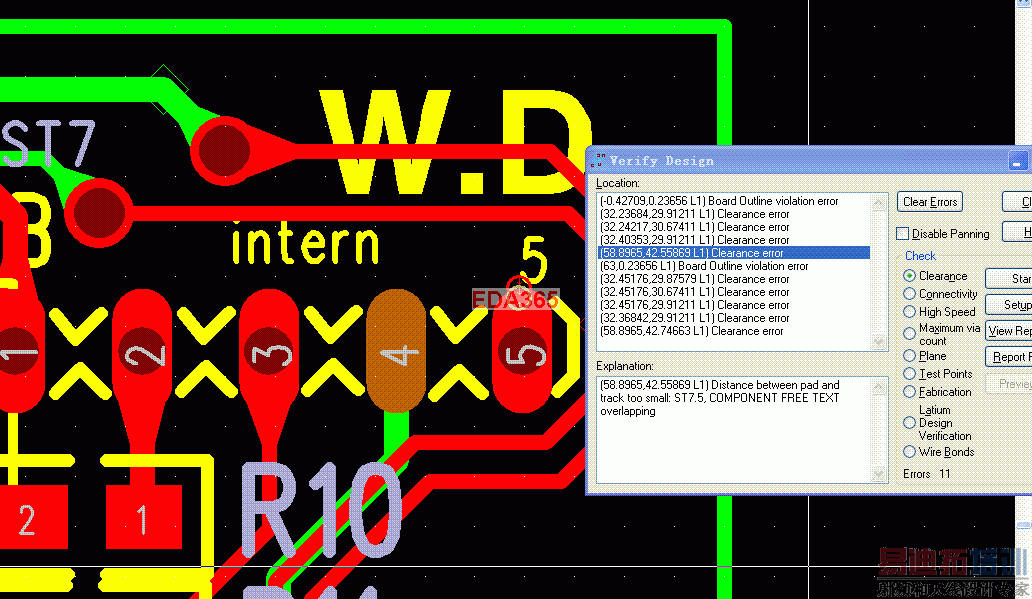 1.pads2007中,执行Rools/Verify Design里面的clearance检测时,我的pcb decal中的TEXT也自动进行了DRC检查(但是PCB DECAL里面的其他丝印都可以与DRC冲突),见图-字符冲突:5与上面的走线有段距离却冲突啦,但是其右边的2D Line画出来的线条离得更近却不报错! 搞不懂是为什么?